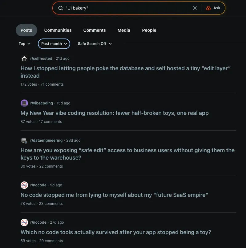Let me be clear: I’m not calling out UI Bakery, the company. This could be a 3rd party contractor they hired that decided to use a shady approach, or a misguided junior employee acting on their own. I doubt the entire team is aware and involved. In any case, someone is artificially boosting the UI Bakery brand name on Reddit.