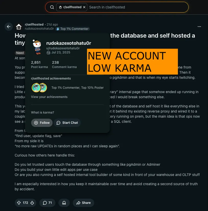 Agentic astroturfing is here. Companies are using AI to engagement-farm and boost their brand on Reddit. For some brands, the vast majority of mentions are coming from obvious bot accounts. It can be hard to spot at first, because the mentions are spread across multiple subreddits and from multiple accounts. But if you follow certain keywords closely, patterns begin to emerge.
