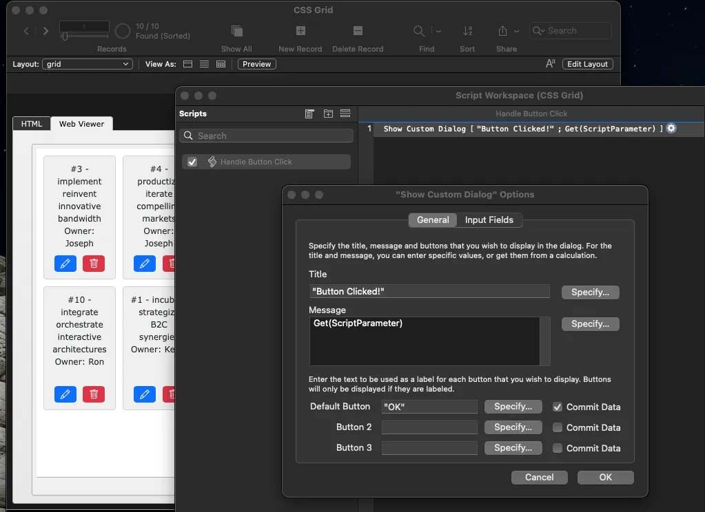 Next, create a new script called Handle Button Click. Add a Show custom dialog script step to display the script parameter, which we will be passing from the web viewer when a button is clicked.