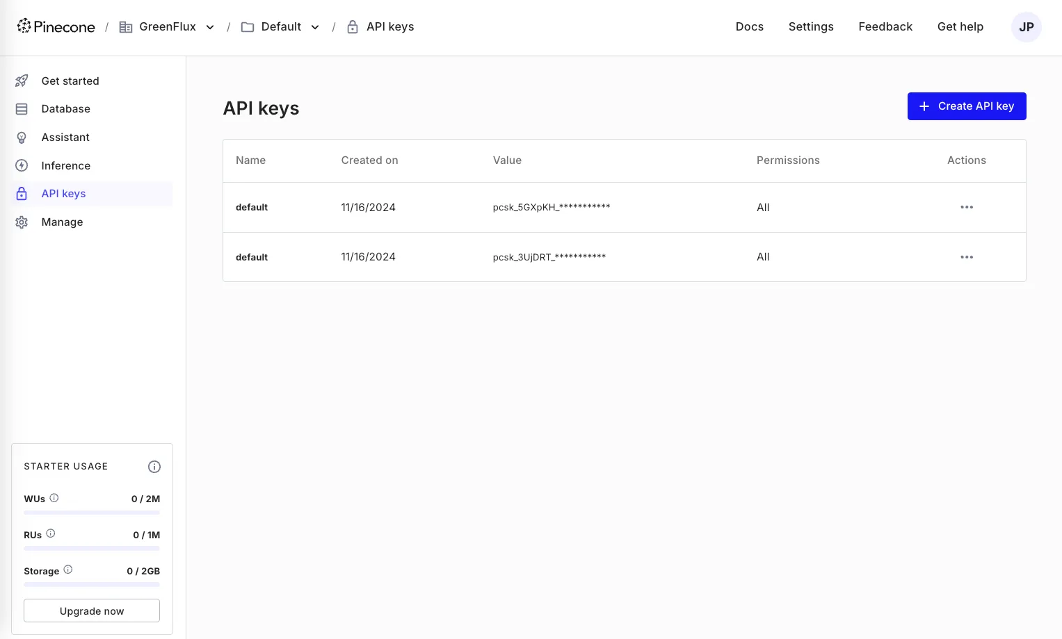 Once you have the folder set up with a few docs, sign up for a free Pinecone account and go to you dashboard. Select API Keys on the left side bar, and copy your key or create a new one.