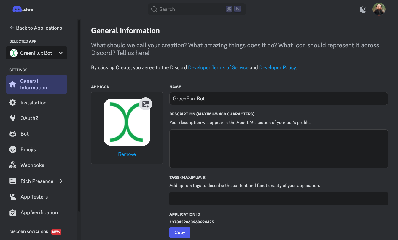 Start out by going to the Discord Applications page click New Application. Give it a name, agree to the terms, and click Create. This will take you to the app’s setting page.