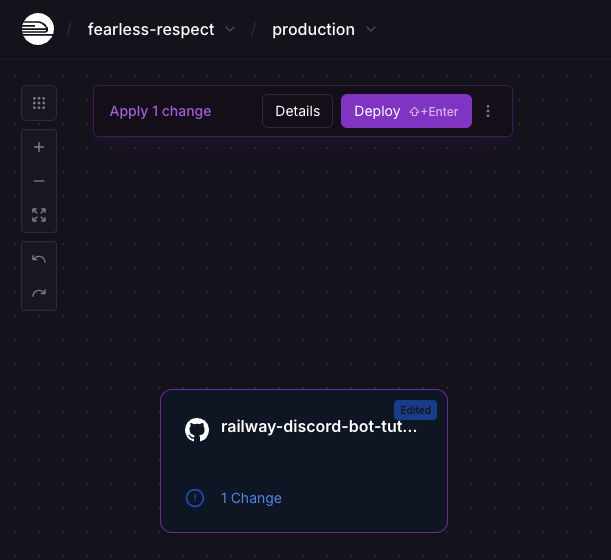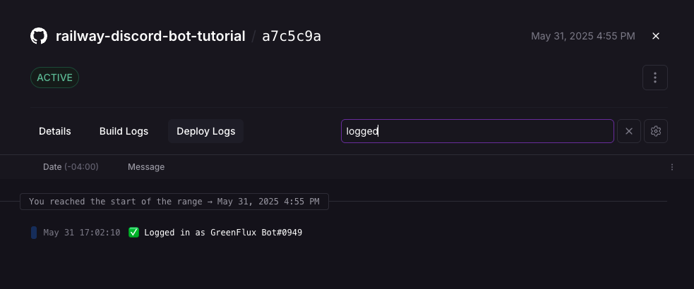 The server should automatically rebuild and deploy. Once the status shows it’s running, click to view the logs. You should see the log entry showing the bot logging into the server.