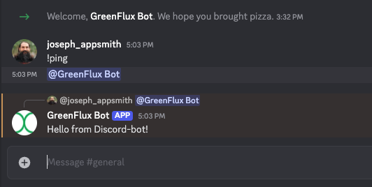 This will start up the bot and log it into any server where it has been installed (using the generated link), then run the on_message() function whenever a message is posted. The function then checks to see if the bot was mentioned, and if so, replies ‘Hello from Discord-bot!’.