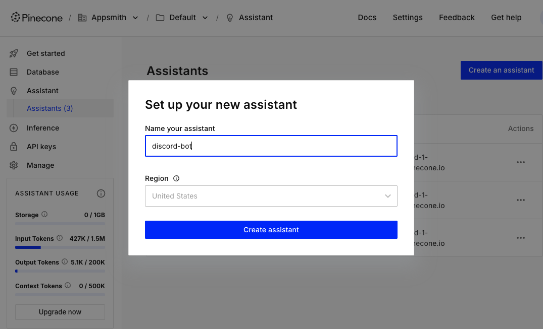 Next, create a free Pinecone account and go to the Dashboard. Then create a new assistant.