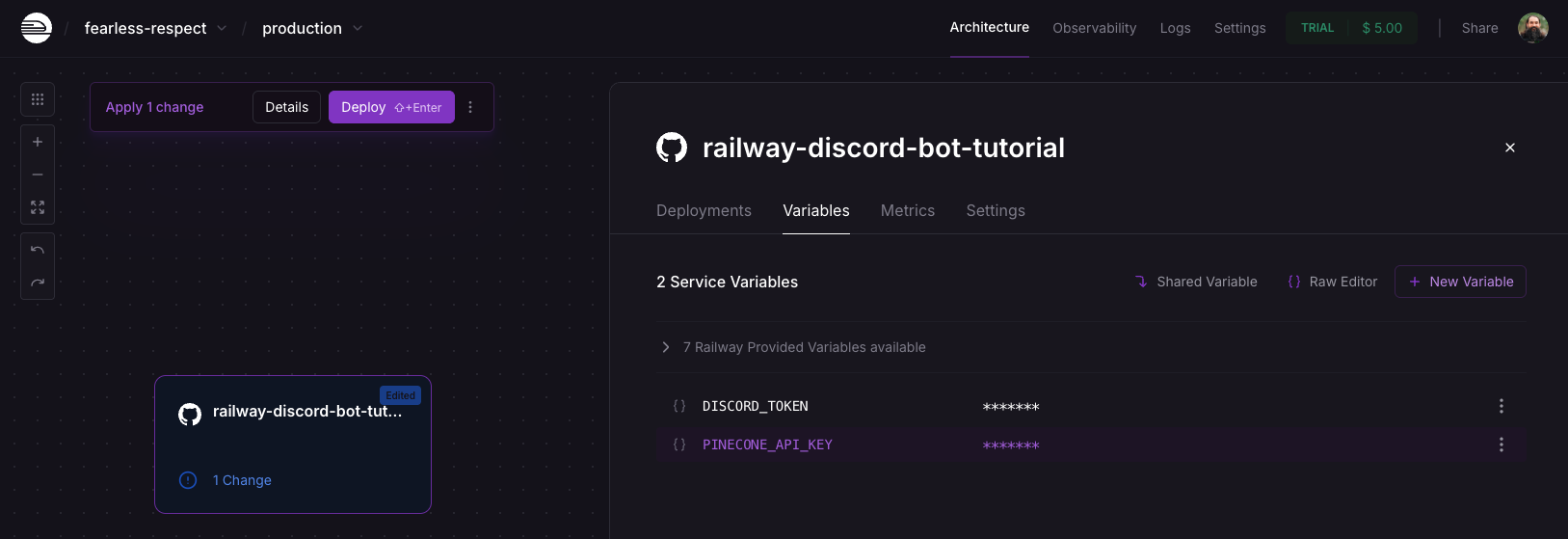 Next, go to the API Keys tab and create a new API key. Then add it as a new variable in Railway with the key PINECONE_API_KEY. Click Deploy.