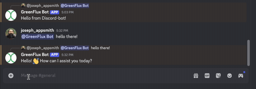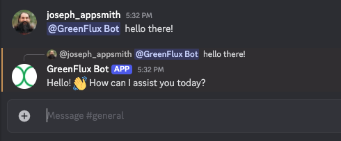 Awesome! The bot is listening to messages, and responding when mentioned. But the response is hard-coded. To get a real reply, we need to send the message to an LLM and generate a response, then send that back to Discord.