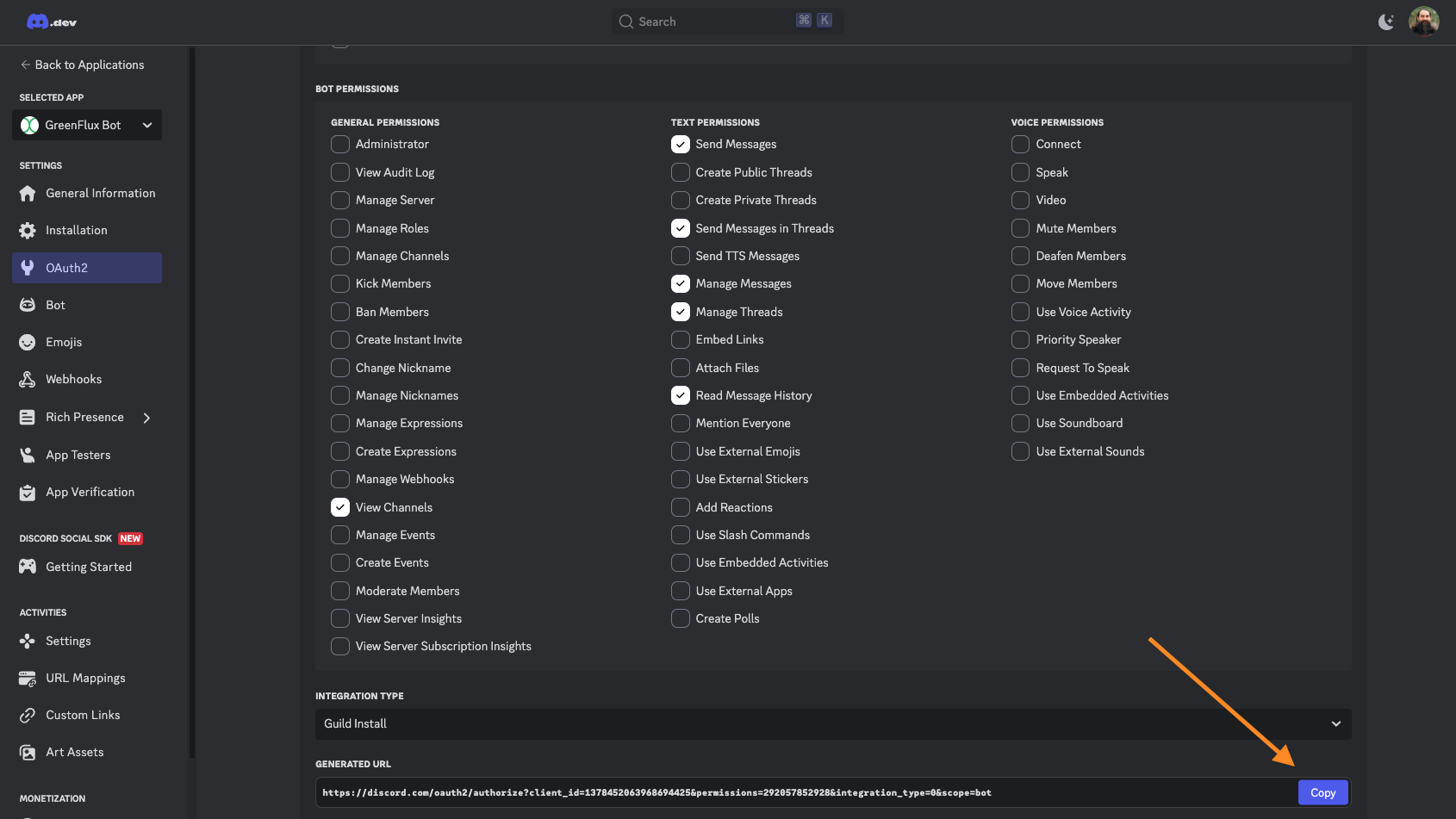 But wait, didn’t we just turn on those same settings in the Bot section? Kind of… In the Bot section, you’re setting the max settings this Discord app should ever have, no matter where it’s installed. Then, in the OAuth2 section, you are selecting the permissions for a single install of the bot on a specific server. You can request up-to the same permissions as the Bot tab, but not more.