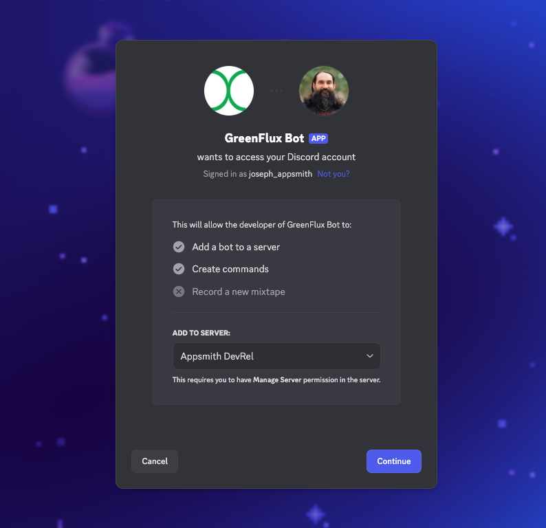 At this point, the bot has permissions to begin posting in the channel. But we don’t actually have a bot running anywhere. We need to set up a server where the bot can run and listen for messages to reply to.