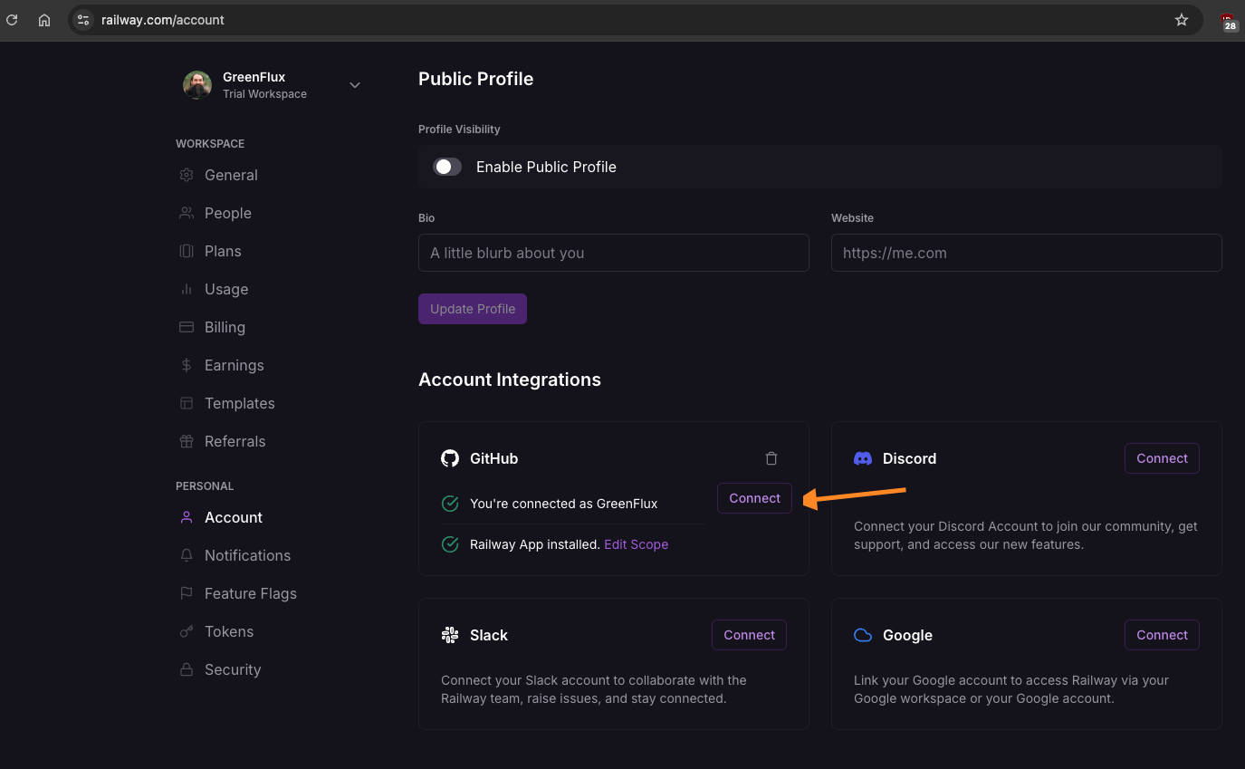 Once you have these 3 files saved to a new repo, head over to the account page in Railway and connect GitHub, then select your repo. If you’ve already connected GitHub for a different repo, click the Edit Scopes button to add a new repo.