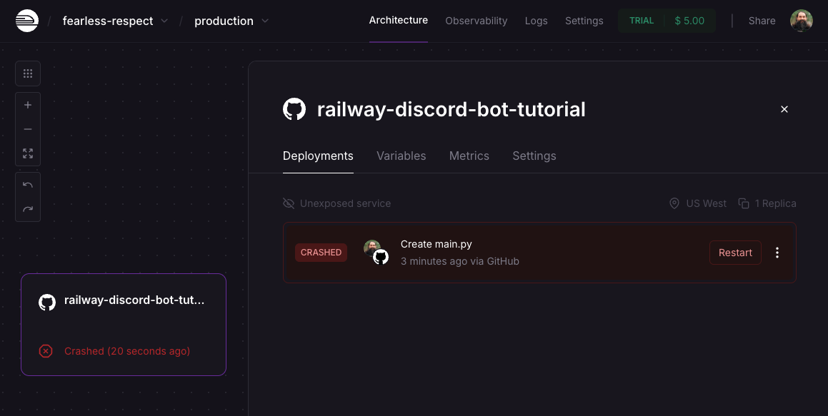 Then create a new project and select the repo as the source. You should see the new project open up, and the server automatically building and deploying. Give it a few minutes to finish. You’ll eventually see a green status saying the deployment was successful, followed by a red status saying the server crashed.