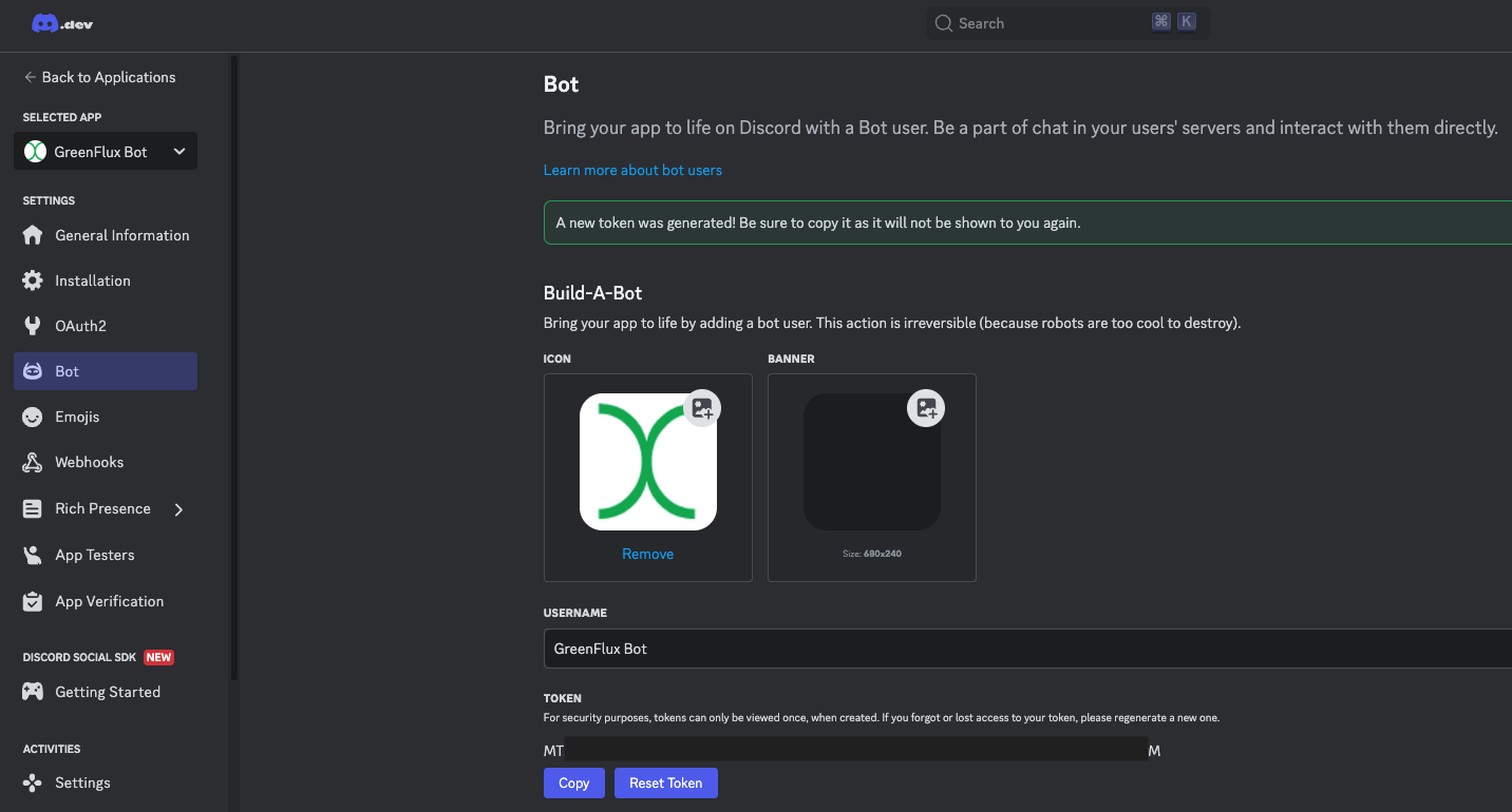 This is because the server is missing the Discord bot token in the environment variables. Head back to the Discord App’s setting page and go to the Bot section. Click Reset Token to generate a new token.
