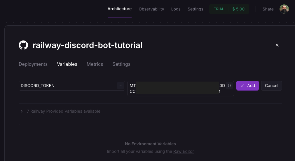 Then add the token as a new variable in Railway, with the key DISCORD_TOKEN.