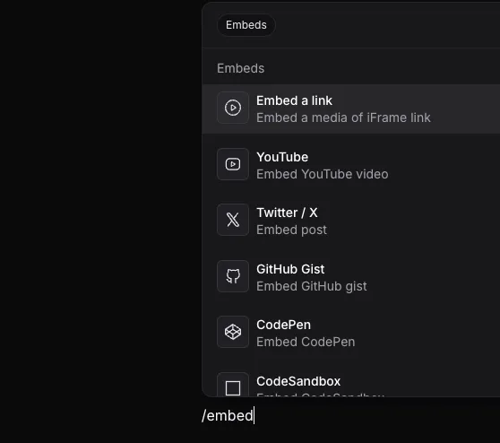 Hashnode has built-in support for embedding content from several different services, using only the URL. You can access the embed menu by typing: