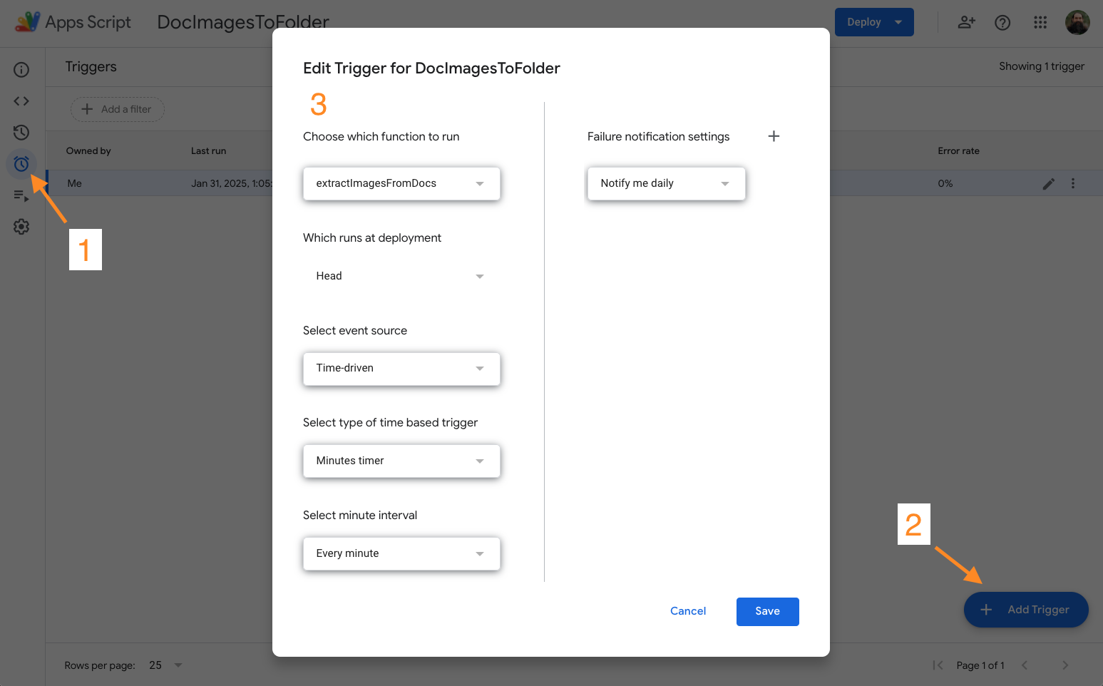 Save the script, and then run the extractImagesFromDocs() function. You should be prompted to approve the script permissions on the first run.