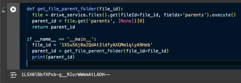 The first step is to get the parent folder’s ID, given a Google Doc ID. Then we can use this to create a new folder in the same directory in the next section.