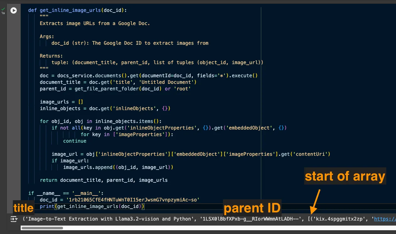 Insert the Doc ID for one of your docs that contains multiple images, and run the cell. You should see the parent folder’s ID printed.