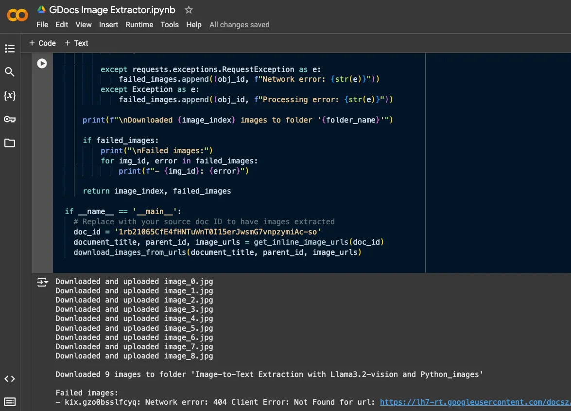 Run the cell with your doc ID and you should see a new folder in the same folder as the original Google Doc, with all of the associated images in it.