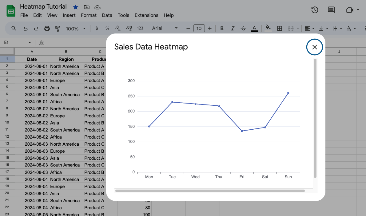 Click save, then select the createHeatmap function in the dropdown and run it. You should see a modal in the sheet with a basic line chart.
