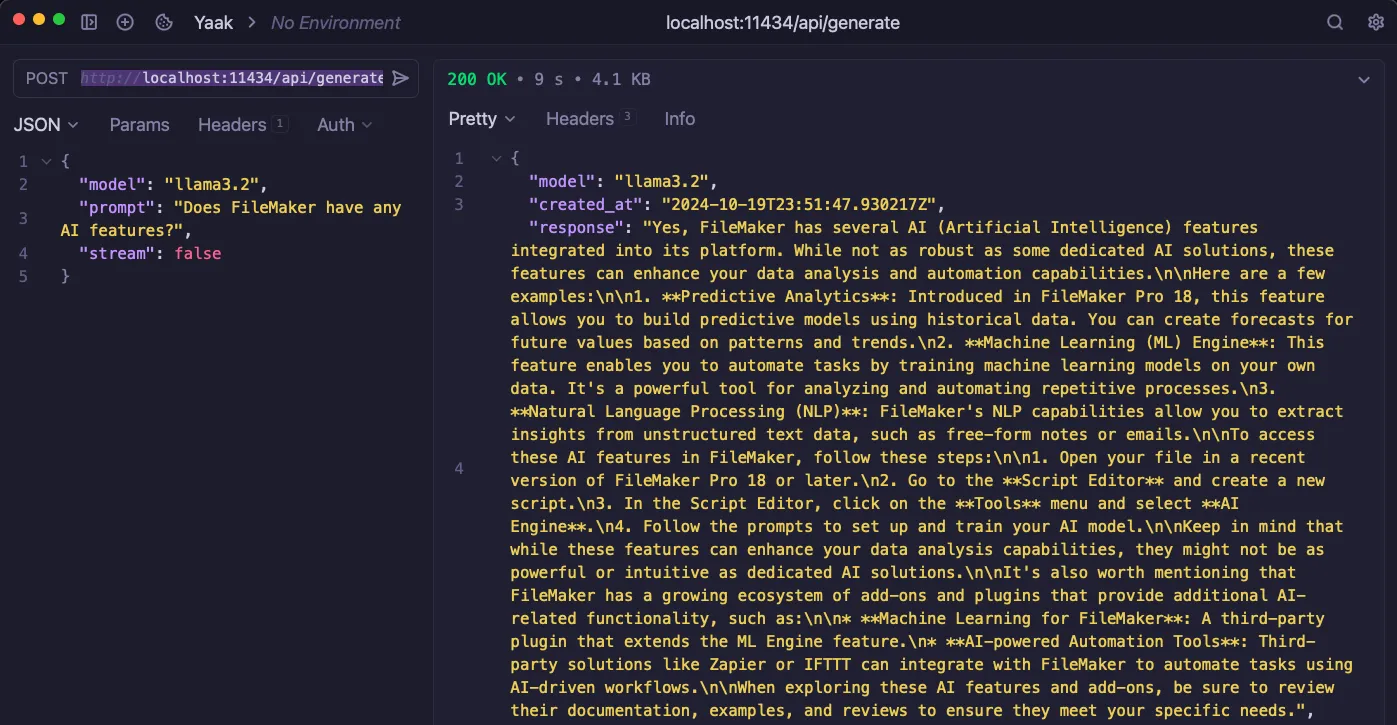 | Body | { "model": "llama3.2", "prompt": "Does FileMaker have any AI features?", "stream": false } |