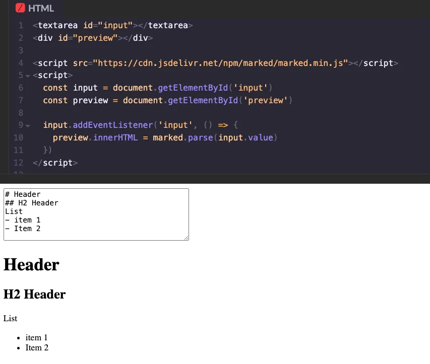 Building a Markdown editor from scratch may sound complex, but the Marked.js library makes it quite easy to set up. Just import the library and select an element, then set the innerHTML to marked.parse(), passing in your Markdown text.