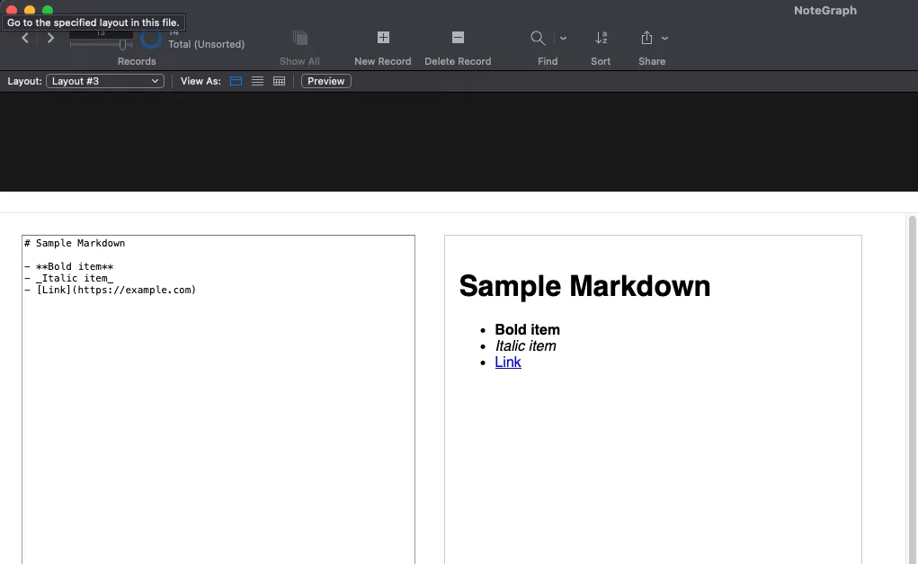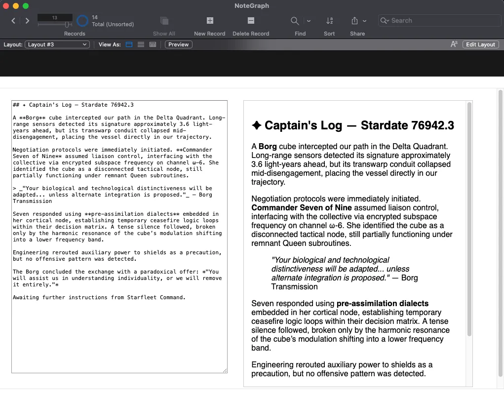 Web viewers in FileMaker Pro are a great way to extend the platform and add new features like a Markdown editor and network graph. Like all the other apps in my FileMaker-Experiments repository, this app is meant to be a proof-of-concept and a starting point, not a complete app. There’s a lot more you could do from here, like outputting the Markdown to PDF, sending it as an email, or adding hover effects and popups to the network graph. Feel free to copy the app and modify for your own use case.