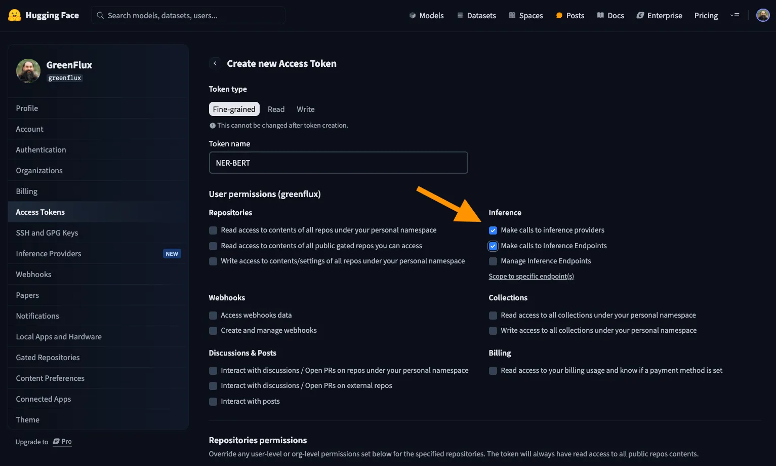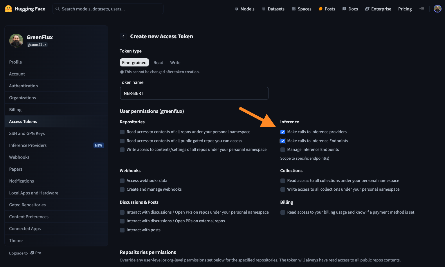 Start out by creating an account with Hugging Face, and then go to the Access Token page. Create a new token, give it a name, and enable the options to make calls to Inference providers and Endpoints.