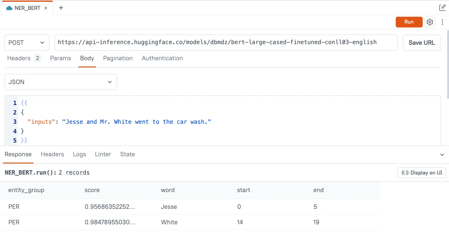 | Body | {{ { “inputs”: “Jesse and Mr. White went to the car wash.” } }} |