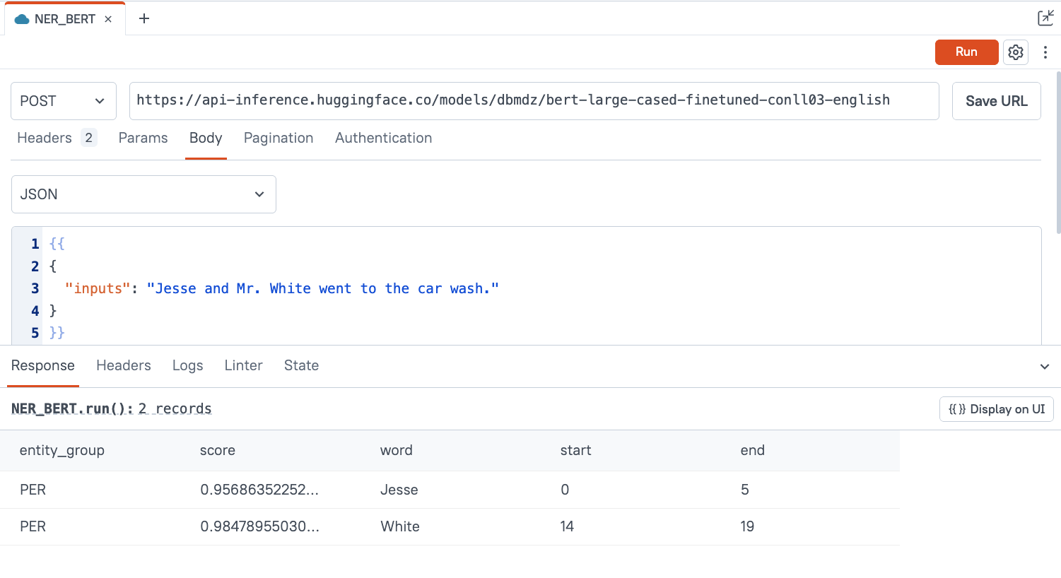 Named Entity Recognition has a wide range of use cases, from tagging files and creating metadata, to automations and knowledge graphs for retrieval-augmented generation. The BERT series of models excels at NER, and Hugging Face makes it easy to integrate it into any app. From here you can save the data to any API or database, trigger automations, or send the data to a human reviewer before running a workflow.