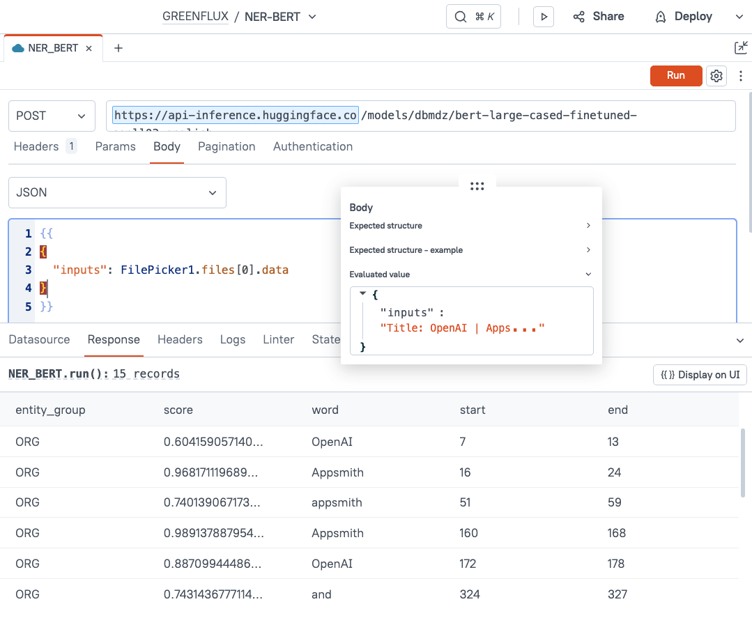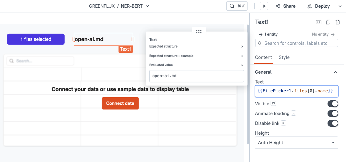 You can also set the FilePicker to run the NER_BERT query when a new file is uploaded, using the onFileSelected event.