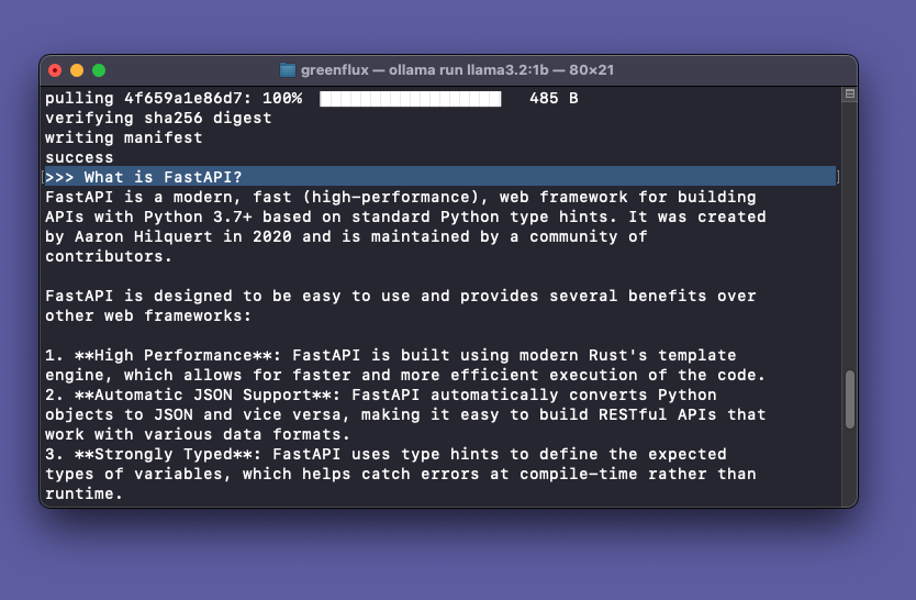 This will download the smaller, 1 billion parameter Llama3.2 model, then run it and let you begin prompting from the terminal. You’ll see several files download the first time running a model, but after that it should load quickly and be ready to start prompting.