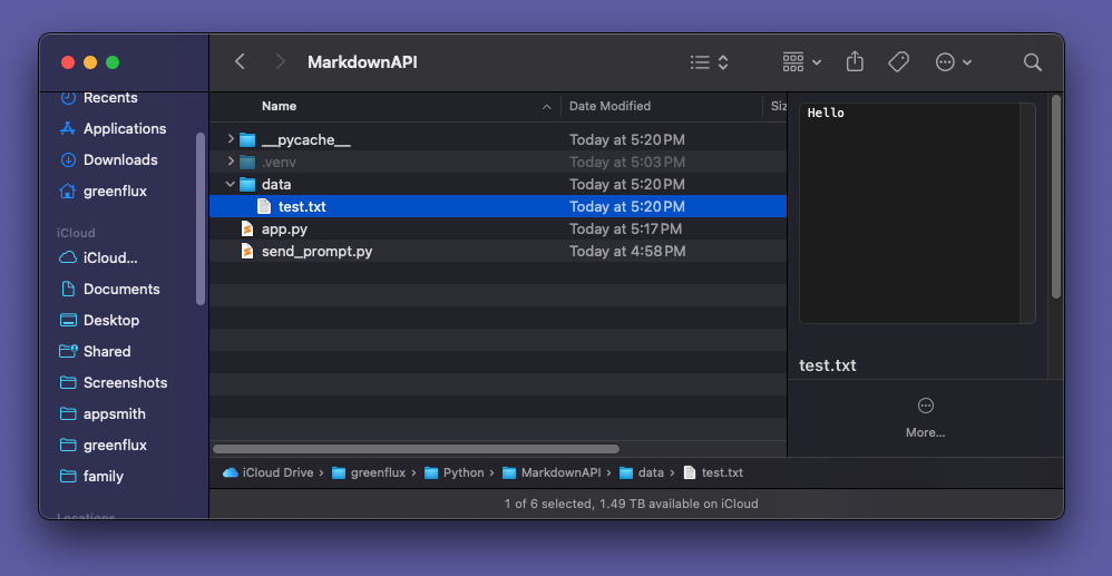 But what about automating the Markdown file creation? Ollama provides a local API for the LLM, but we need a local API for creating/editing Markdown files. It only takes a few lines of Python to handle the text file management, and that can easily be turned into an API using FastAPI.