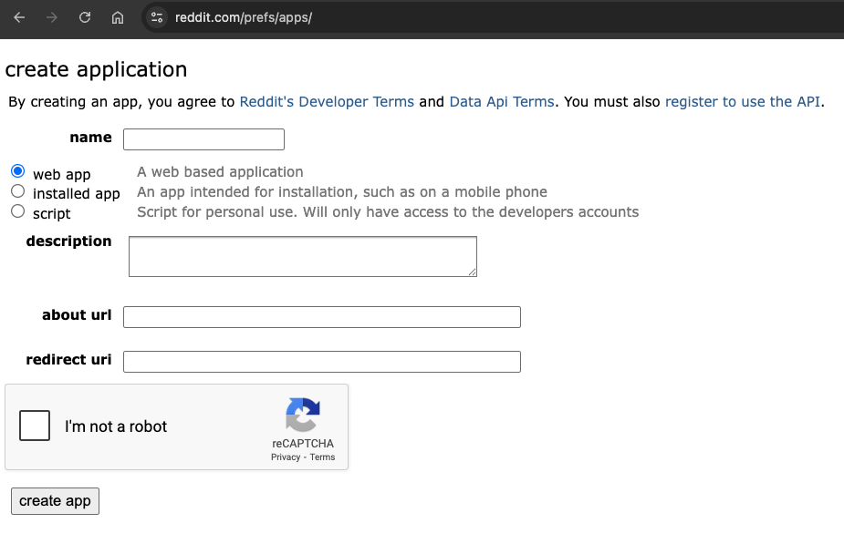 Start out by creating a new app in your Reddit account and choose Script for the type. For the redirect URL, enter: