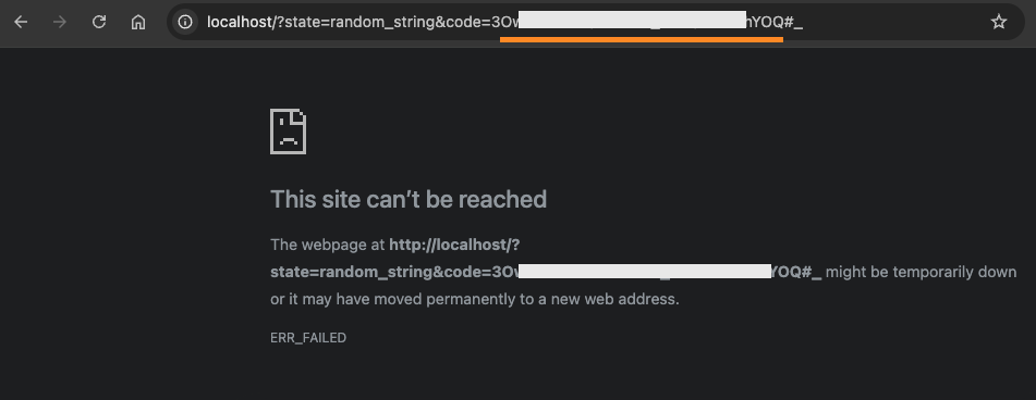 After clicking Allow, it should redirect you to your localhost, with the verification code in the URL parameter. The browser will show an error, unless you happen to have a web server running on your local host, but all you need is the code from the URL to use in the next step.