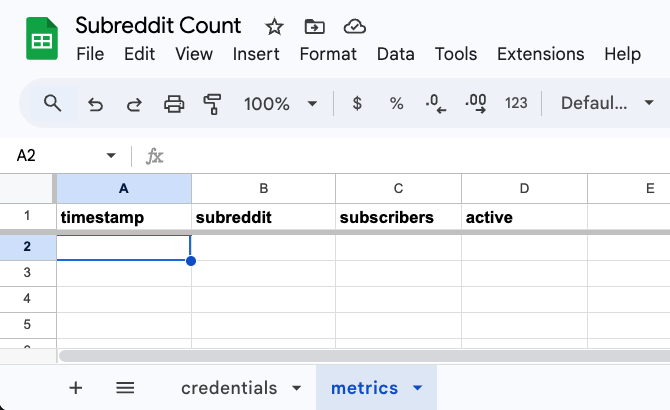 Lastly we’ll add a function to pull some metrics about a subreddit, and save it to a new sheet. Create a metrics sheet and add columns for timestamp, subreddit, subscribers, and active_users.