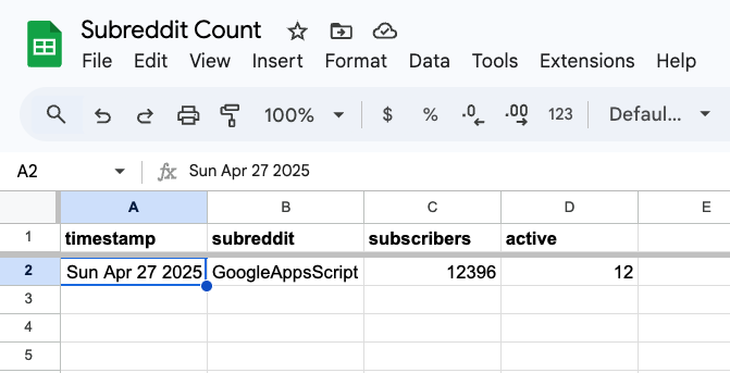 Save and run the function, and approve the new permissions if needed. You should now see a new row logged from the Reddit API.