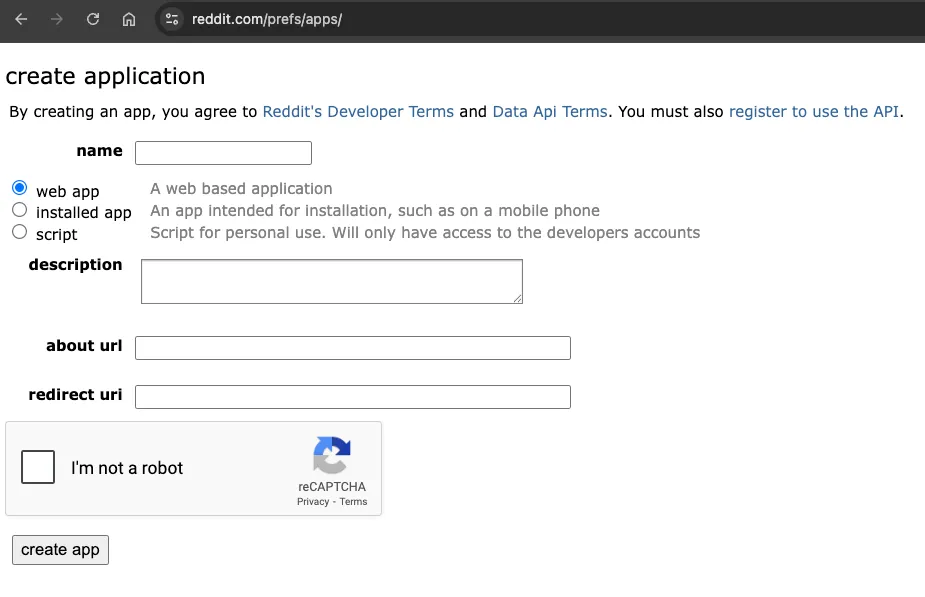 Start out by creating a new app in your Reddit account and choose Script for the type. For the redirect URL, enter: