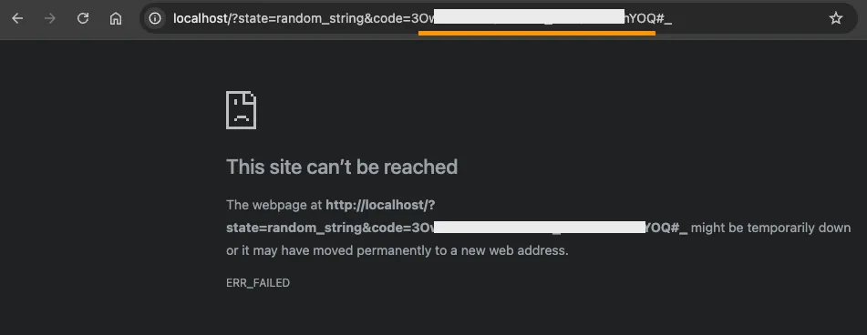 After clicking Allow, it should redirect you to your localhost, with the verification code in the URL parameter. The browser will show an error, unless you happen to have a web server running on your local host, but all you need is the code from the URL to use in the next step.