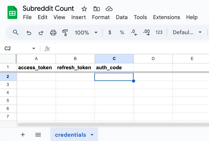 Create a new Google Spreadsheet with a credentials sheet, and columns for access_token, refresh_token, and auth_code.