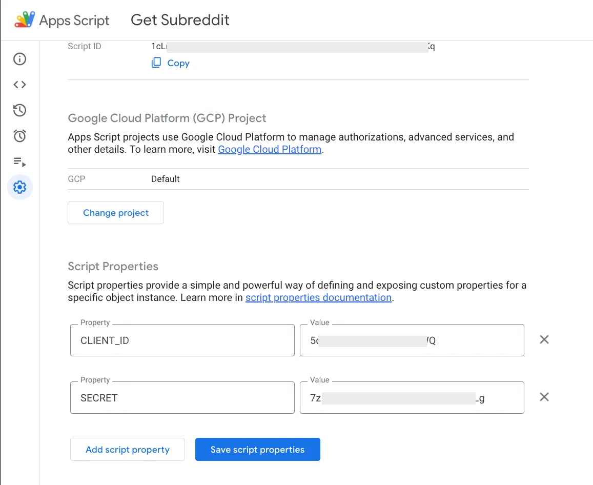 Next, go to Project Settings and scroll down to Script Properties. Add properties for the CLIENT_ID and SECRET and add the values from your Reddit app.