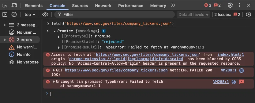 If you’re trying to fetch SEC data from the browser, especially from environments like CodePen or a local dev server, you’re gonna have a bad time. The SEC API does not include CORS headers, so you can’t access it directly from the frontend due to browser security restrictions.