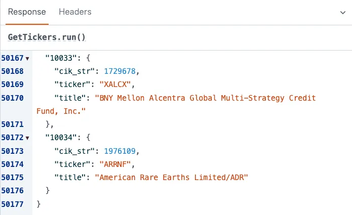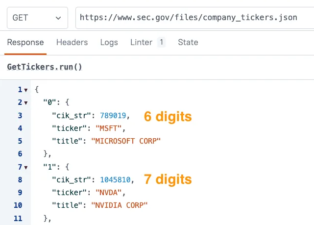 That’s not an uncommon pattern with REST APIs, but it is complicated by the leading zeros that must be added in the URLs. CIK numbers should be padded with zeros to ensure the string is 10 characters. But that’s not how the /company_tickers.json endpoint returns them.