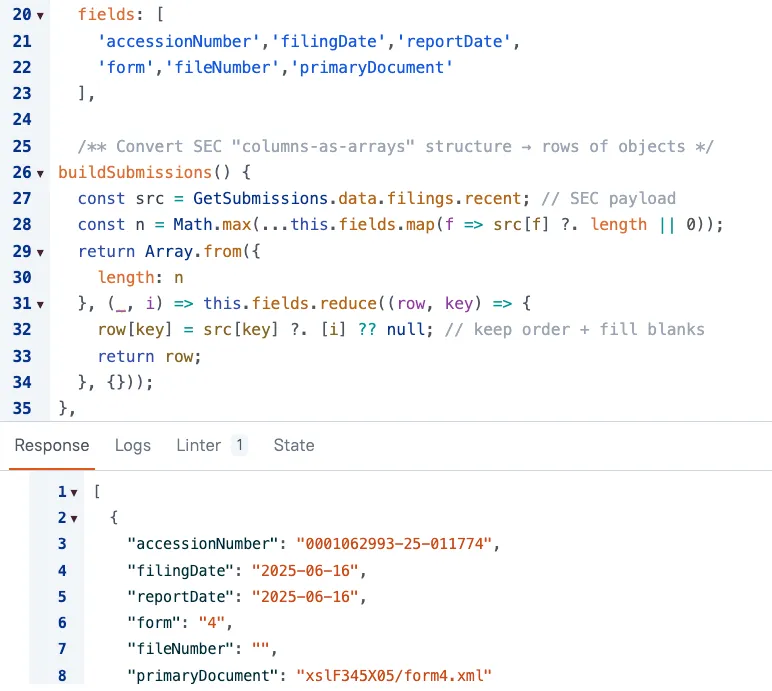 const src = GetSubmissions.data.filings.recent; // SEC payload