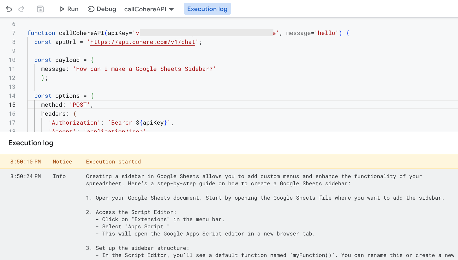 Insert your API Key in the first line, click Save, and then run the function. You should see the AI's response in the Editor Log.